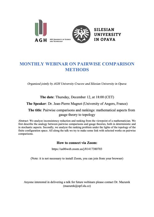 Abstract: We analyze inconsistency reduction and ranking from the viewpoint of a mathematician. We first describe the analogy between pairwise comparisons and gauge theories, both in deterministic and in stochastic aspects. Secondly, we analyze the ranking problem under the lights of the topology of the finite configuration space. All along the talk we try to make some link with selected works on pairwise comparisons.